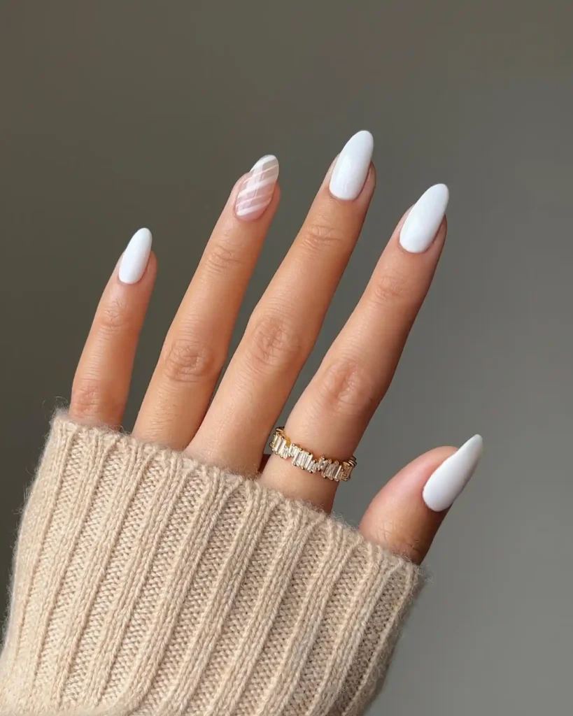 I went for bright white almonds with one playful accent. The ring finger has sheer diagonal stripes that peek through. It breaks up the solid color in a simple way. Cozy sweater weather nails.