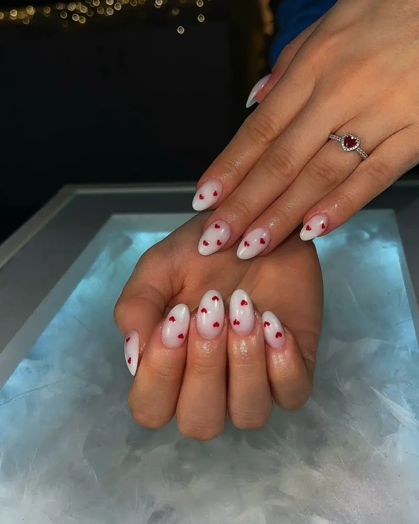 I chose a soft white base with tiny red hearts. The dots of color feel sweet and flirty. Short ovals keep the design wearable. Perfect for date night or a casual day.