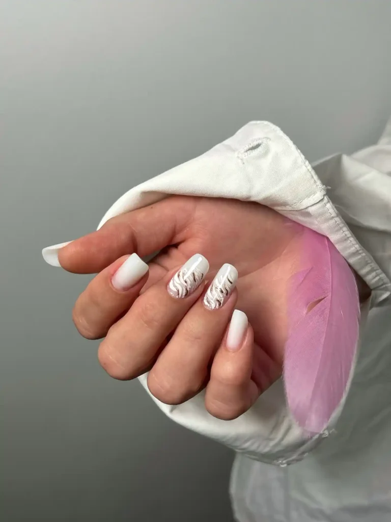 These short milky whites look fresh and effortless. The faint swirl accents keep the look playful while staying minimal. I reach for this style when I want tidy hands that go with everything. It reads neat, not fussy.