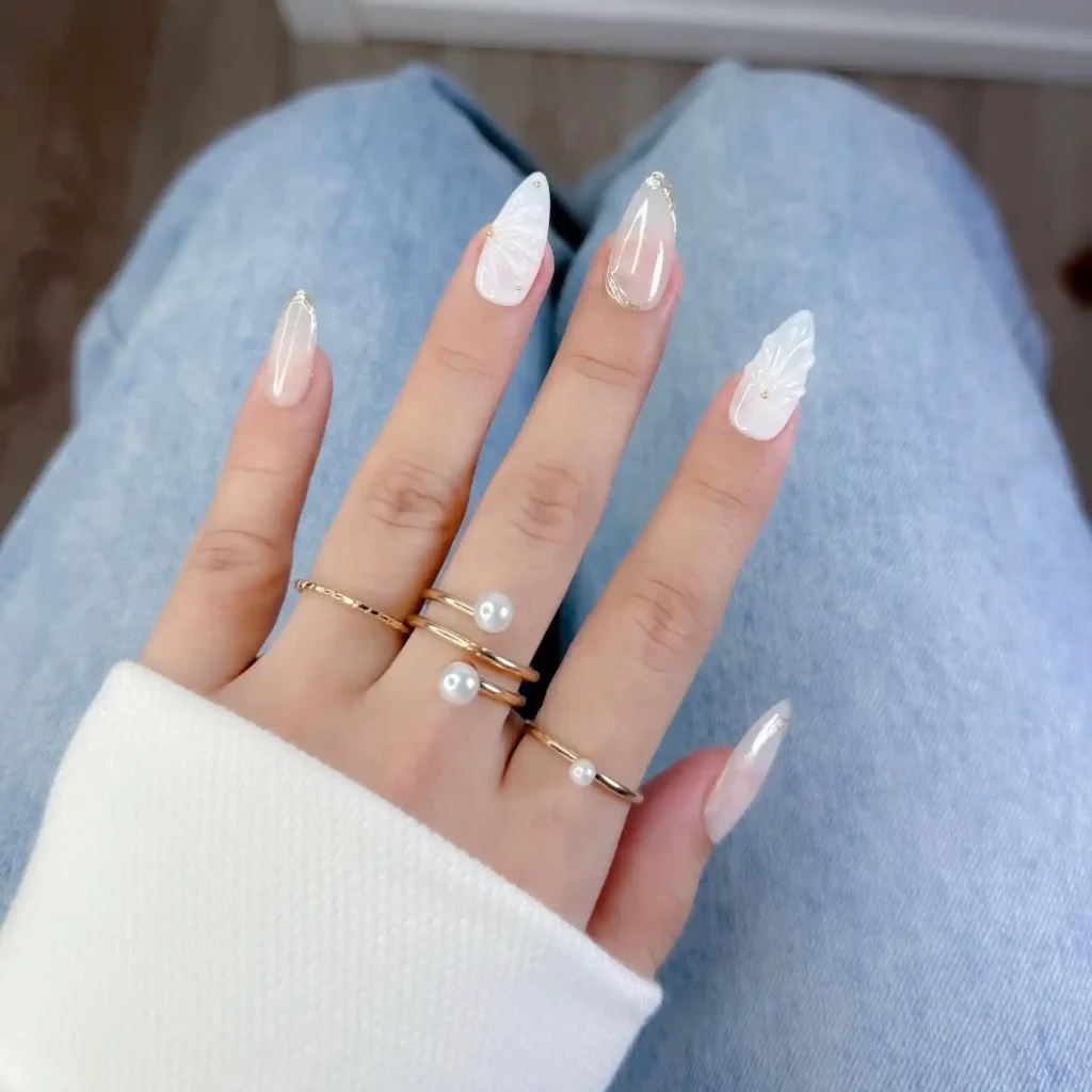 This set mixes sheer white with delicate sculpted details. The fine gold edging frames each nail and lifts the design. I like how the translucence keeps it airy. It’s elegant without feeling heavy.