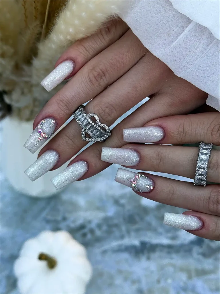 A sugar-glitter accent adds a bridal feel without looking heavy.