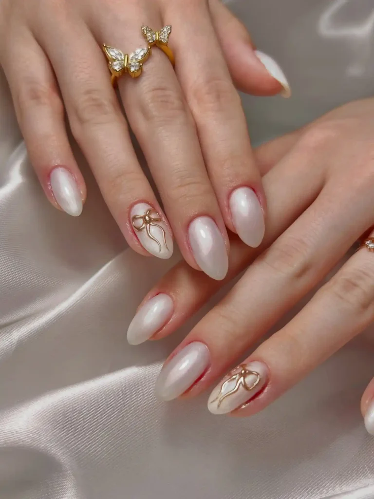 A sculpted bow sits like jewelry on the accent nail. It feels couture and feminine.