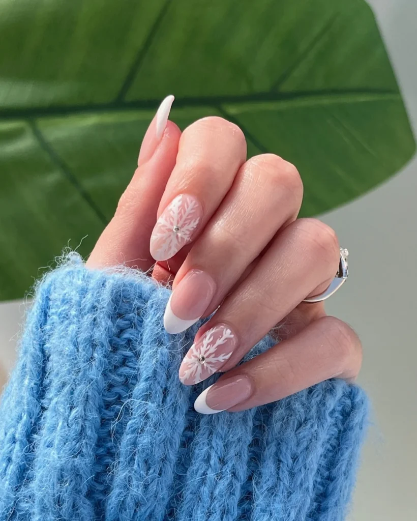 Classic French tips get a winter makeover with soft nude bases and delicate snowflake accents. Each snowflake is detailed in white with a tiny rhinestone center, adding sparkle without overwhelming the look. The almond shape enhances the elegance, making these nails ideal for both everyday wear and special holiday gatherings.