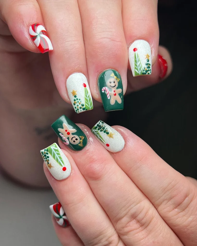 Fun and festive, this manicure bursts with holiday spirit through playful designs. Each nail alternates between snowy white bases, green backgrounds, candy cane swirls, and cheerful gingerbread men. Tiny holly leaves, gold stars, and red dots add even more detail, making every finger a tiny holiday canvas.