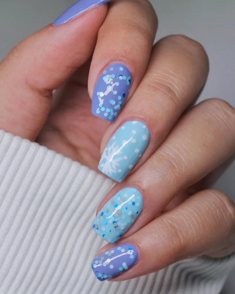 Frosty shades of blue create a magical winter scene on this manicure. Light and dark blue nails mix with glitter and delicate snowflake accents, resembling frosted windows on a snowy day. The varying tones add depth, making the design look joyful yet seasonal.