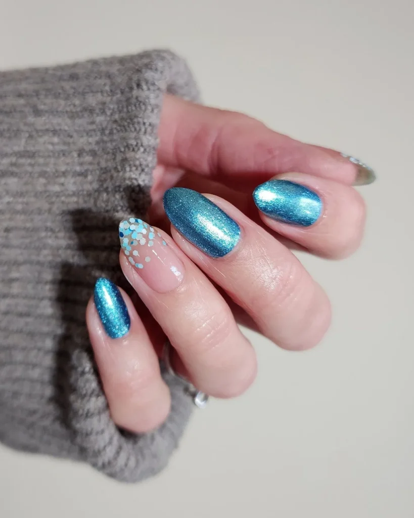 Sleek metallic blue polish makes these nails shimmer like icy skies. A few accent nails feature clear bases with scattered blue glitter, softening the bold metallic effect. The mix of textures adds variety, creating a look that’s striking but wearable.