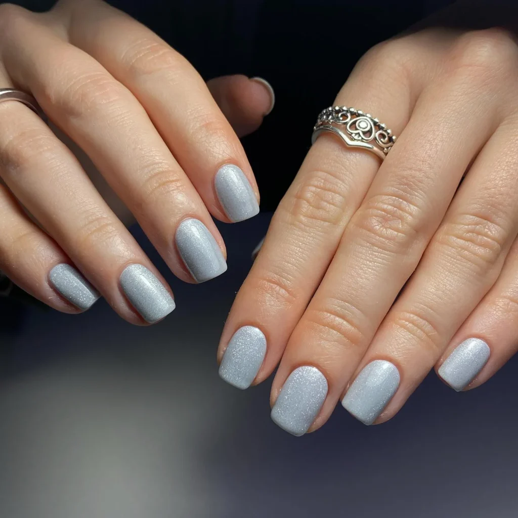 Soft silver shimmer elevates these short square nails into a frosty masterpiece. The subtle sparkle gives them a polished, icy glow without being too bold. Perfect for those who prefer practical lengths with elegance, this manicure pairs beautifully with silver jewelry and cozy knits.