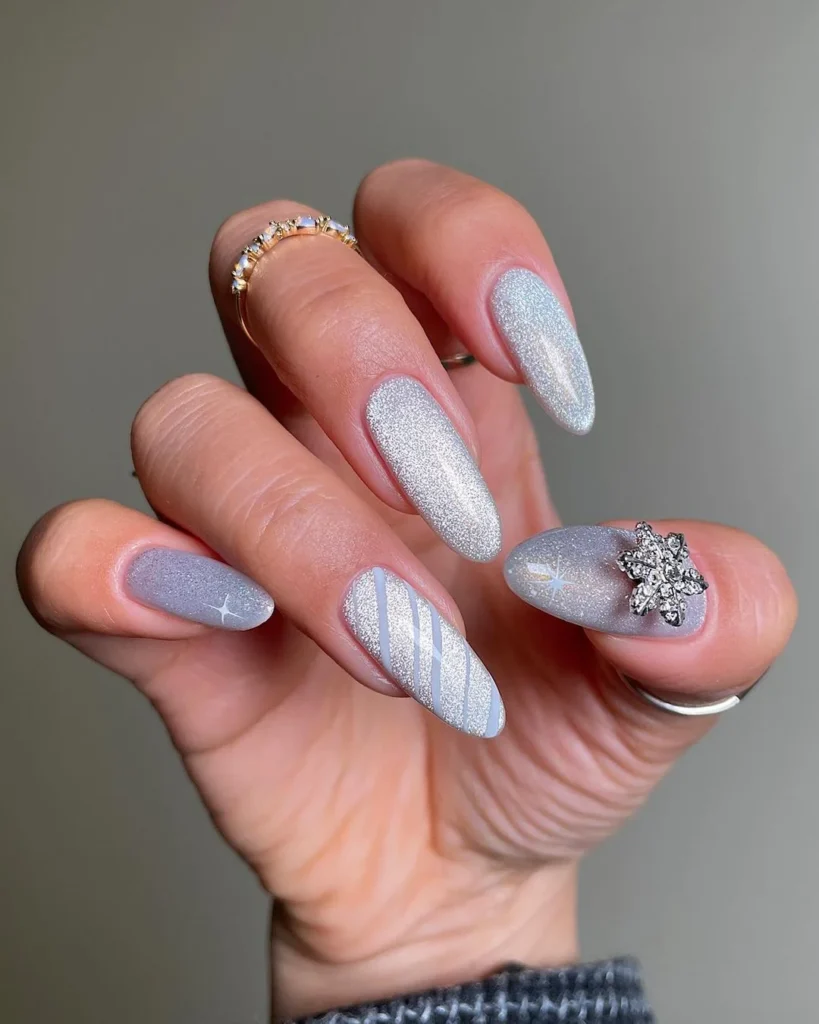 Shimmering silver polish forms the foundation of this dazzling manicure. A mix of designs — from stripes to snowflakes — keeps the look playful and festive. One standout nail features a 3D snowflake embellishment, making it the star of the set.