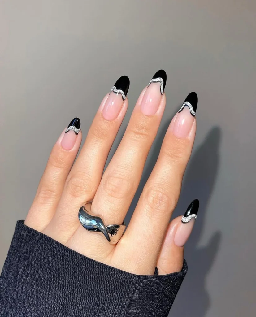 A bold twist on the French manicure, these nails feature jet-black tips outlined with silver glitter. The nude base keeps them refined while the black and silver combo makes them stand out. The almond shape adds extra elegance, balancing sharpness with femininity.