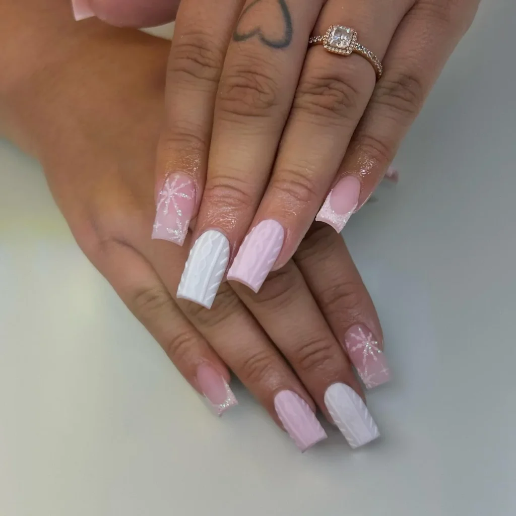 Playful texture meets soft tones in this pink and white manicure. Each nail features intricate cable-knit sweater details, delicate snowflakes, and pastel shades that bring coziness to your fingertips. The mix of textures makes the nails feel dynamic, with matte and glossy contrasts highlighting the design.