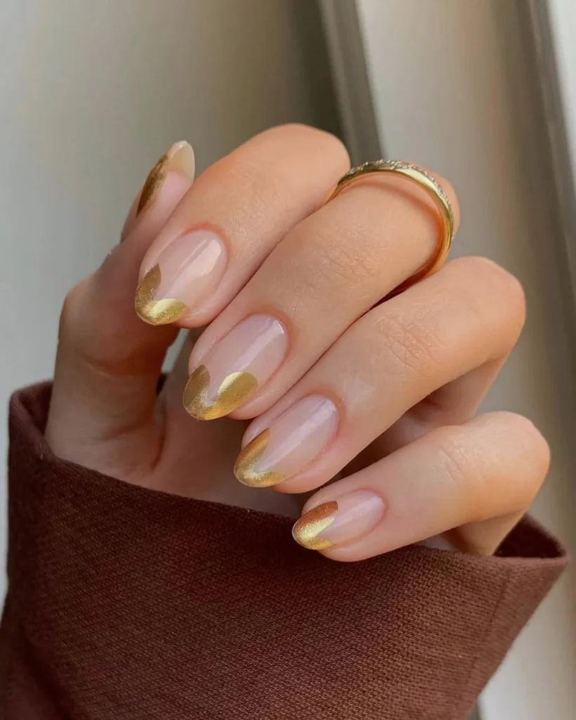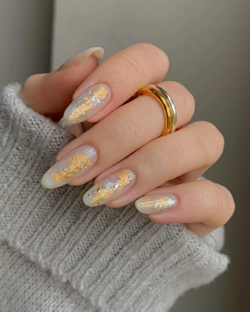A delicate mix of shimmer and shine defines this golden manicure. Each nail is adorned with foil-like flakes of gold and silver layered on a translucent nude base, giving a frosted, icy look. The uneven patterns add an artistic, natural touch, as if the nails were brushed with metallic snow.