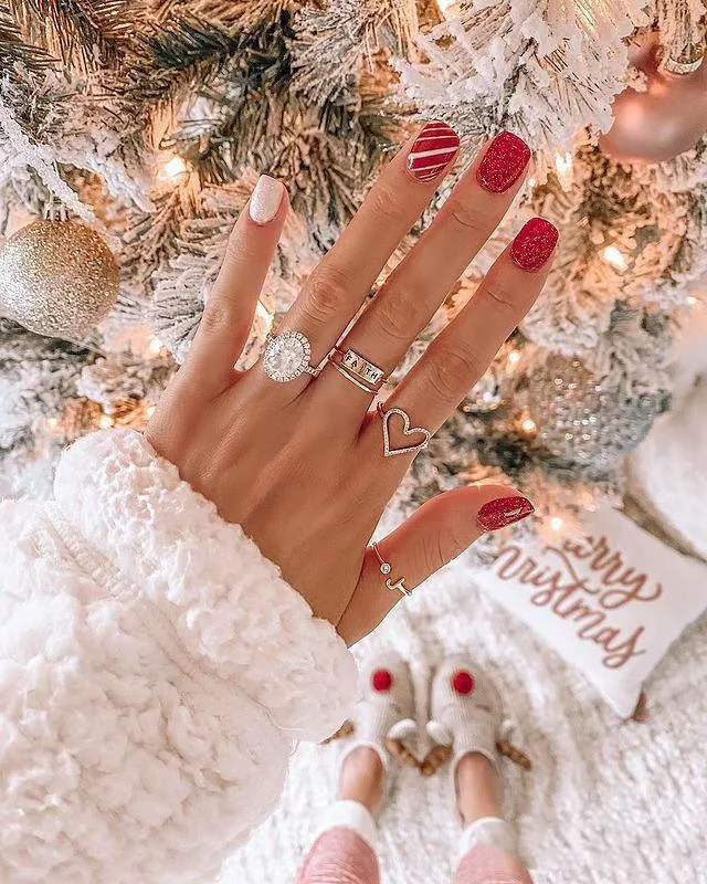 Festive cheer takes center stage in this red and white manicure. Glittering red polish pairs with candy cane stripes and snowy accents, instantly evoking holiday magic. The sparkling finish of the red nails creates a lively contrast with the crisp white, making them a true seasonal statement.