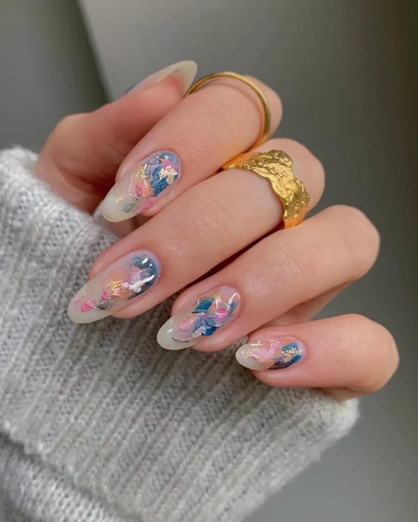 Whimsical pastel hues blend with metallic foil to create these dreamy abstract nails. Shades of pink, blue, and lavender melt together like a watercolor painting, topped with flecks of gold for added sparkle. The design feels light and airy, making it perfect for those who prefer softer tones with a creative edge.