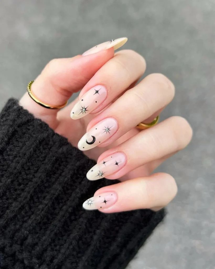 Ethereal and stylish, these celestial nails combine nude bases with delicate black stars and moons. The fine linework gives a minimal yet magical look, balancing simplicity with cosmic detail. Each nail feels like a night sky, carrying a quiet beauty that’s both trendy and timeless.