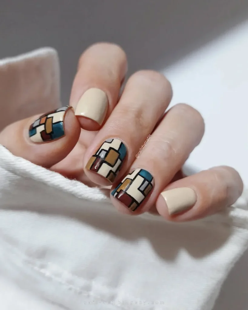 A sophisticated combination of beige and vibrant geometric patterns, this nail design stands out with its fusion of earthy neutrals and bold accent colors. The mix of rectangles and squares in blue, brown, and yellow adds visual interest, making it a versatile and stylish choice for fall. The muted beige tone helps to tone down the bold patterns.