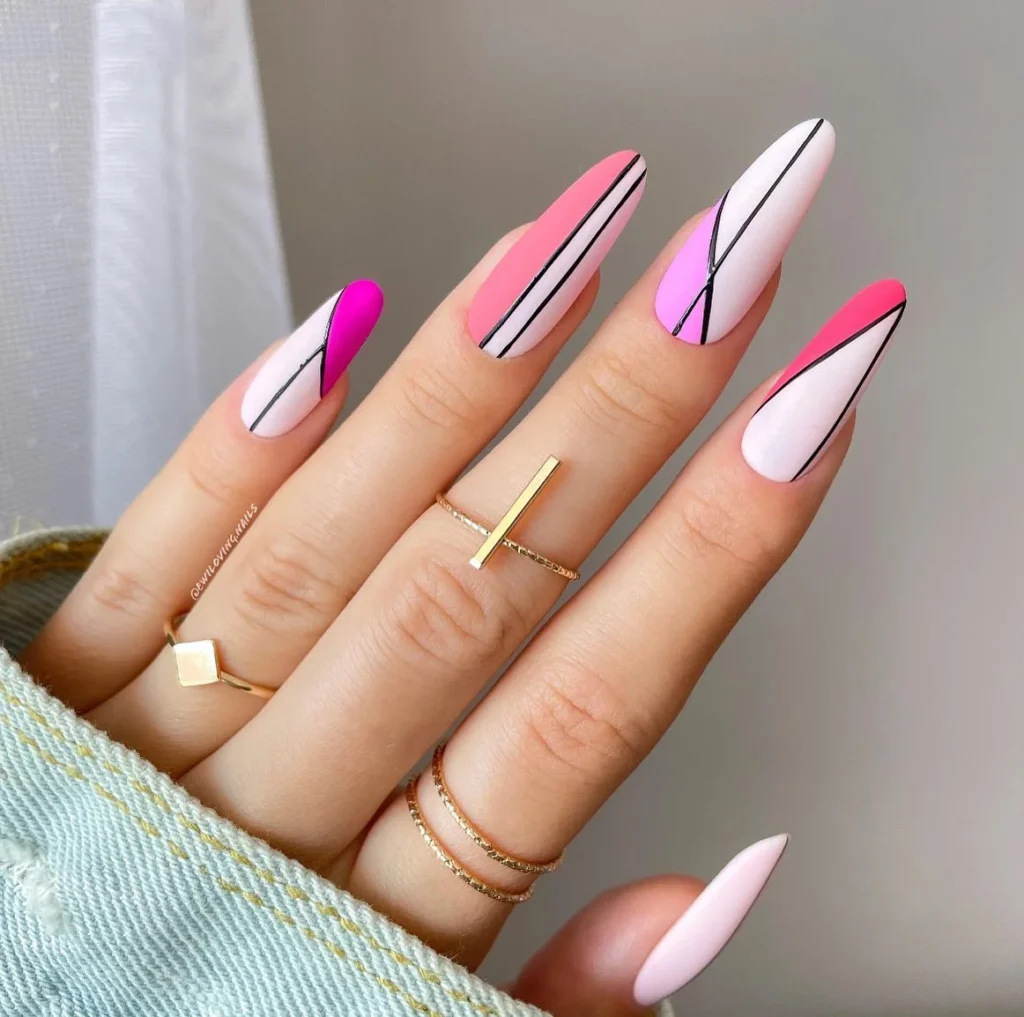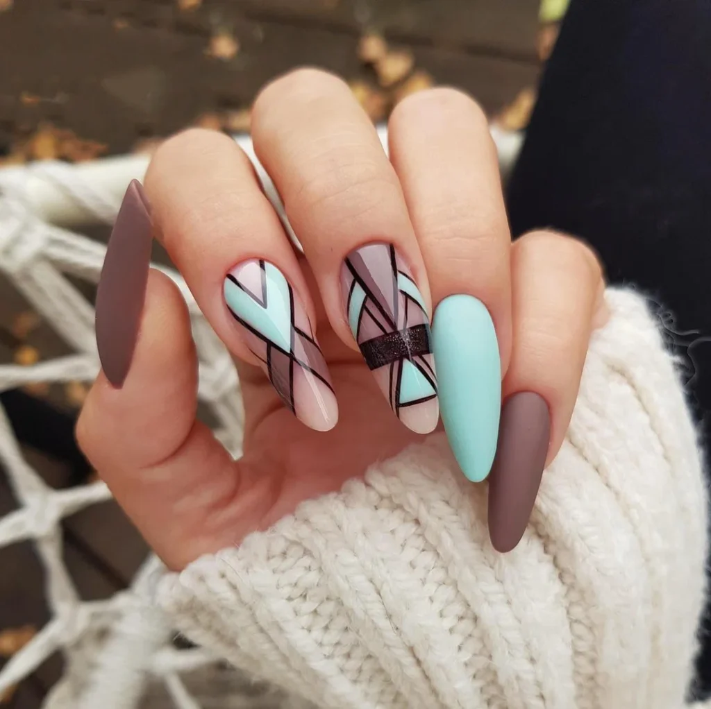 Soft pastel hues like mint, lavender, and nude are expertly paired with sharp, contrasting geometric shapes for a look that’s both modern and refined. The design features a mix of matte and glossy finishes, giving it a contemporary edge. The addition of bold black lines and angular shapes across the nails creates a striking contrast against the soft background.
