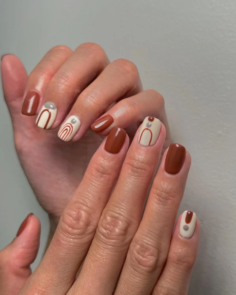 Warm brown tones meet creamy beige for a balanced geometric nail design. Subtle arcs and dots create an elegant, minimal pattern that feels modern yet cozy. Perfect for autumn outfits, this look adds a chic twist to neutral nail colors.