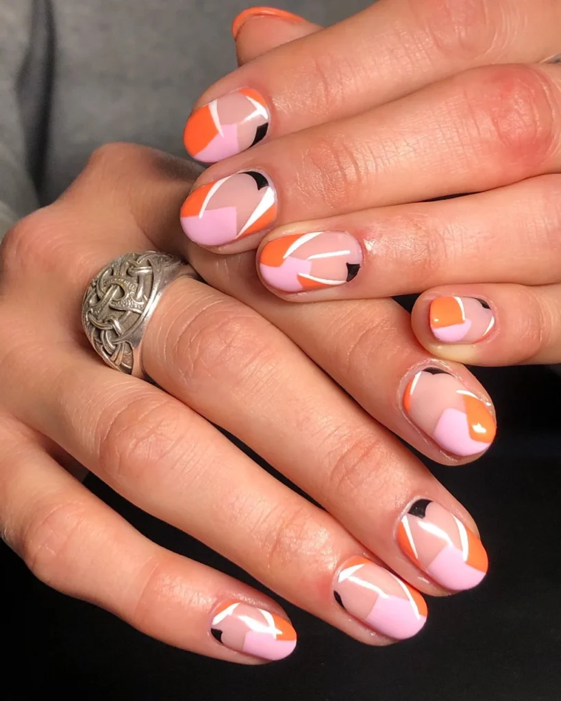 Bright orange and soft pink come together in this fun geometric design. Angular shapes and sharp lines add a dynamic flair, while touches of black bring extra contrast. A lively choice for fall that keeps your manicure playful and trendy.