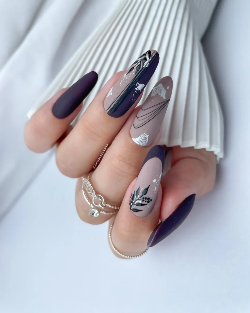 Deep matte purple contrasts beautifully with soft nude tones in this geometric-inspired look. Delicate black leaf accents and metallic silver details enhance the design with elegance. A sophisticated fall manicure that mixes nature-inspired and abstract elements.