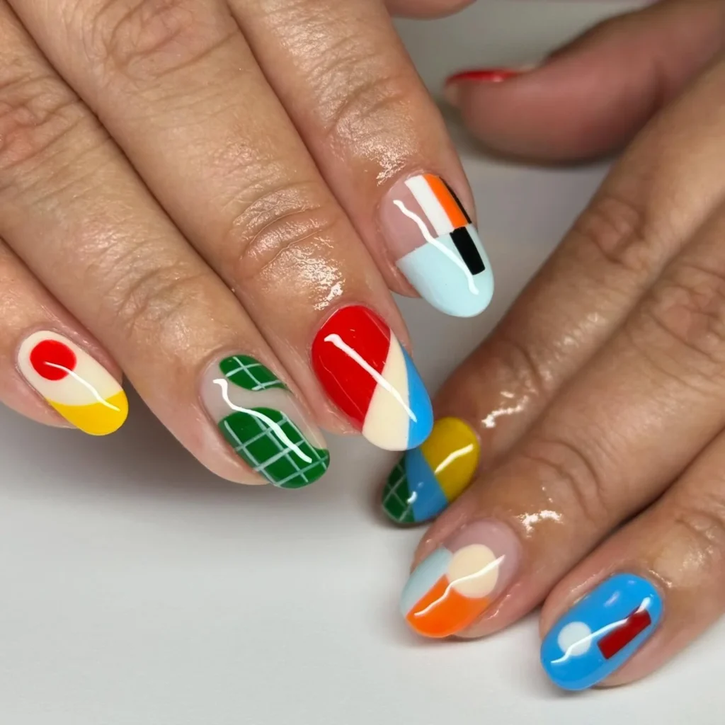 Vivid red, green, blue, and yellow create a playful geometric manicure full of personality. Each nail showcases a unique combination of color-blocking and patterns. A bold choice for fall, perfect for those who love statement nails.