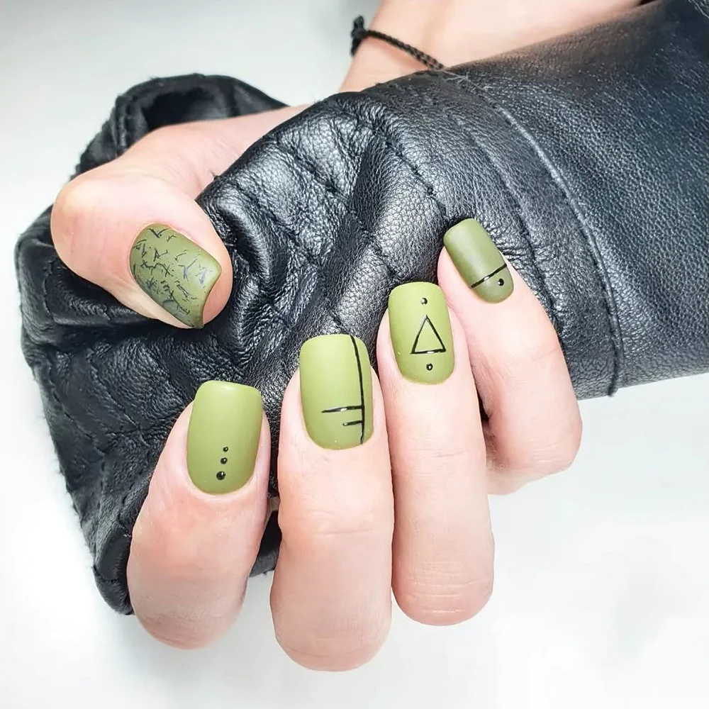 Earthy olive green sets the base for this modern geometric nail art. Minimalist black lines, dots, and triangle symbols add a sleek edge. This design is understated yet powerful, making it perfect for fall vibes.