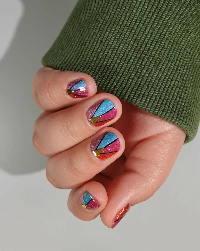Glittering shades of blue, pink, and red create a stained-glass effect in this striking design. Black outlines and golden accents bring structure to the geometric look. A vibrant fall manicure for those who love color and shine.