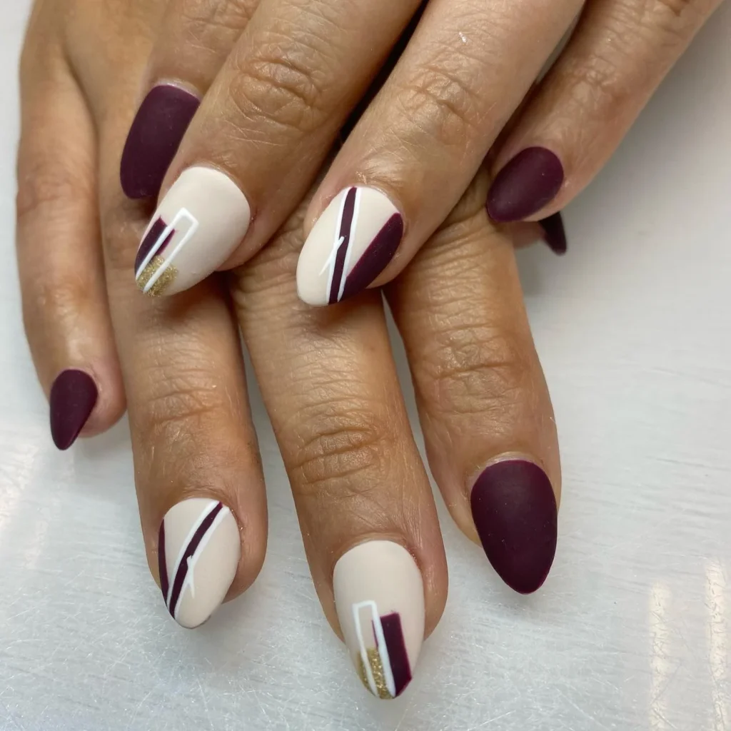 A classy mix of matte burgundy and nude tones forms the base of this manicure. Thin lines and metallic details create a chic geometric finish. The contrast feels refined, making this design perfect for fall evenings.