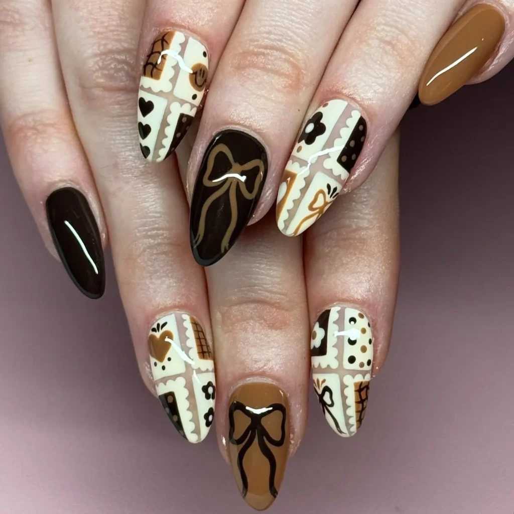 Playful bow details mix with brown and cream geometric blocks for a creative manicure. The varied patterns across each nail make this design both unique and eye-catching. A charming style that’s perfect for fall’s cozy season.
