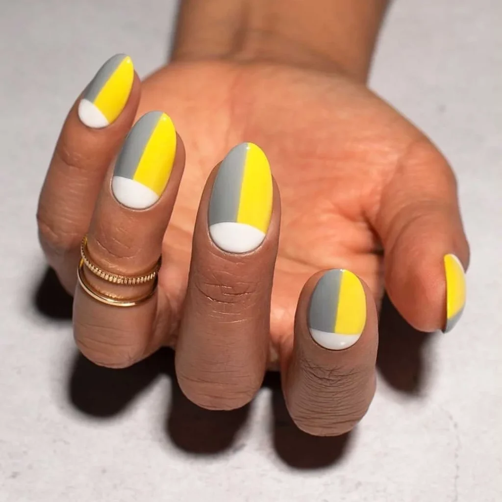 Bright yellow pops against gray and white for a bold geometric look. The sharp color-blocking creates a clean, modern effect that stands out. A stylish fall manicure idea for anyone who loves minimal yet striking nail art.