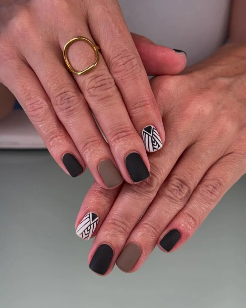 Balanced tones of matte black and earthy brown bring a chic, modern twist to this fall manicure. The highlight comes from the crisp geometric white accents with fine black linework that add an artistic edge.