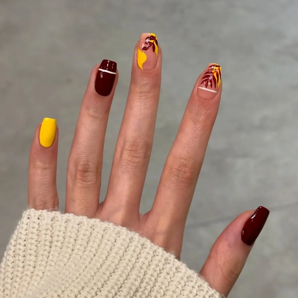Inspired by the changing leaves of fall, this nail design features rich, autumnal hues of burgundy and mustard yellow. The nails are adorned with delicate leaf patterns that capture the essence of fall foliage, adding a natural touch to the geometric design. The use of clean white accents sharpens the edges of the leaves, adding a crisp and fresh element.