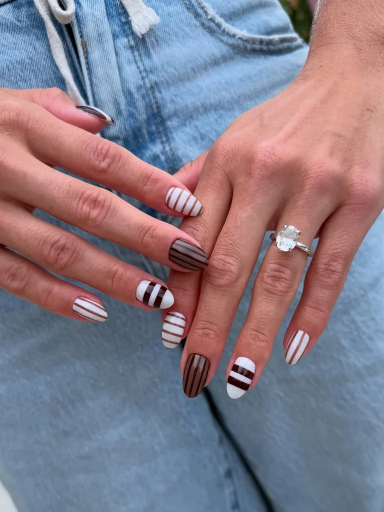 A contemporary fall design, these nails feature alternating brown and white stripes in a clean, geometric layout. The crisp, linear design creates a minimalist yet bold look that suits both casual and formal occasions. The simple color palette of brown and white allows the striking geometry to stand out, while the matte finish adds experience.