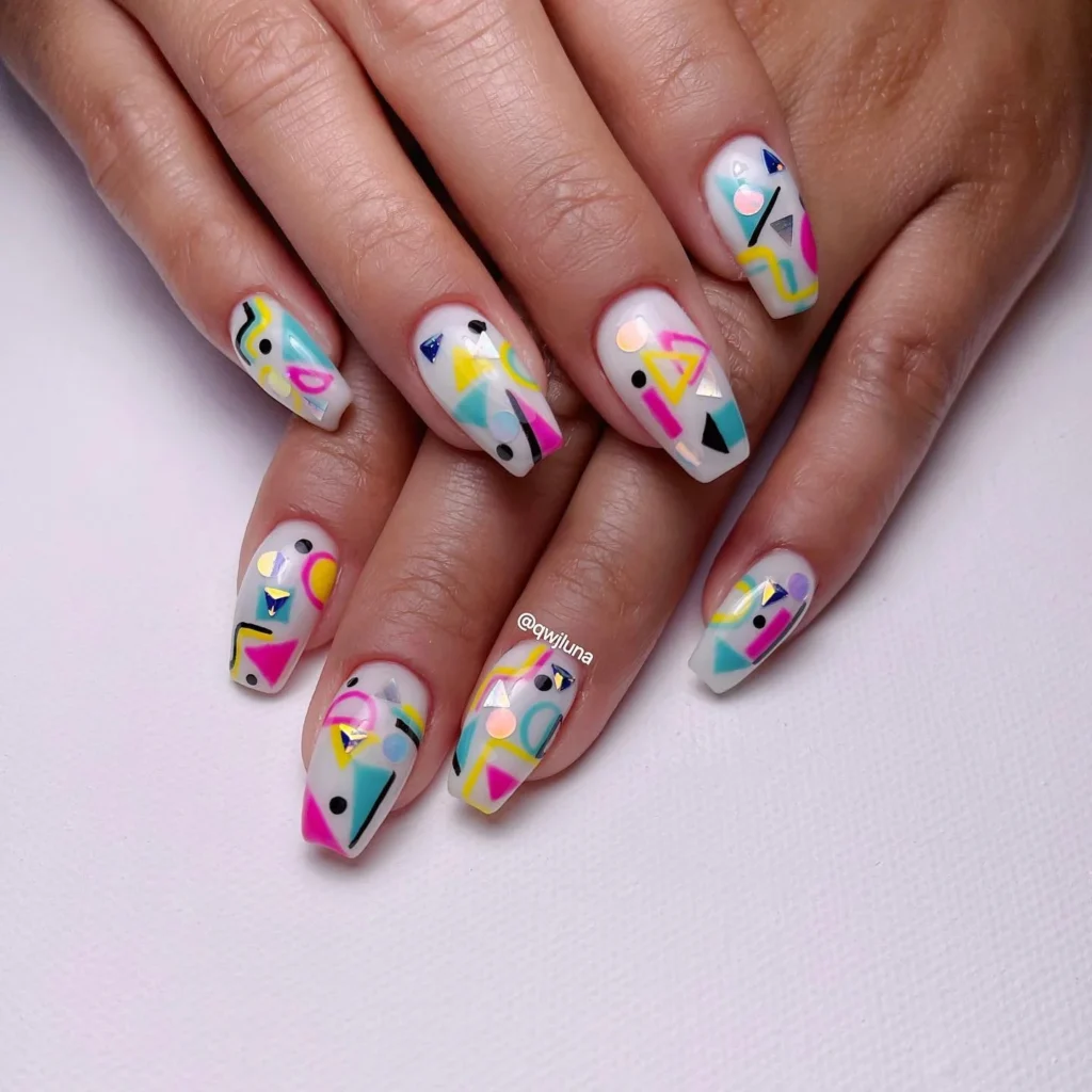 This vibrant geometric nail design embraces bold and energetic colors like neon pink, turquoise, yellow, and black. The dynamic combination of triangles and abstract shapes creates an artsy, joyful vibe perfect for the fall season. The colorful, angular patterns pop against a neutral base, giving the nails a fun, fresh look.