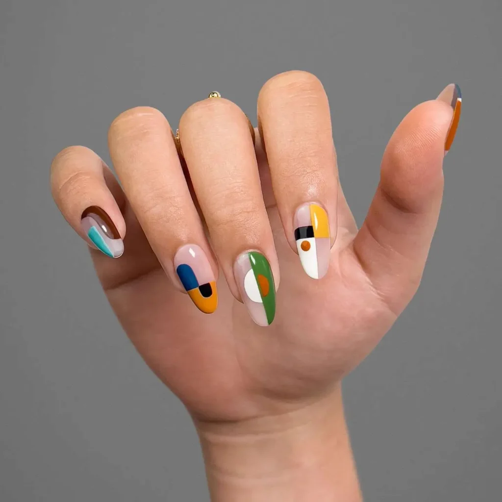 Featuring a stunning palette of muted earthy tones like green, orange, and blue, this nail design incorporates smooth, rounded geometric shapes for a balanced and modern fall look. The soft edges of the geometric shapes contrast beautifully with the vibrant colors, giving the nails a natural, organic feel while still maintaining a structured design.