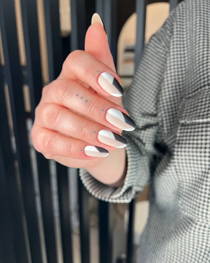This modern twist on the classic French tip design uses bold black and white colors with sharp geometric angles. The black tips contrast beautifully with the white base, giving the nails a striking yet sophisticated look. The crisp lines and geometric form make these nails feel contemporary and fresh, offering a chic and minimalist take on the traditional French manicure.