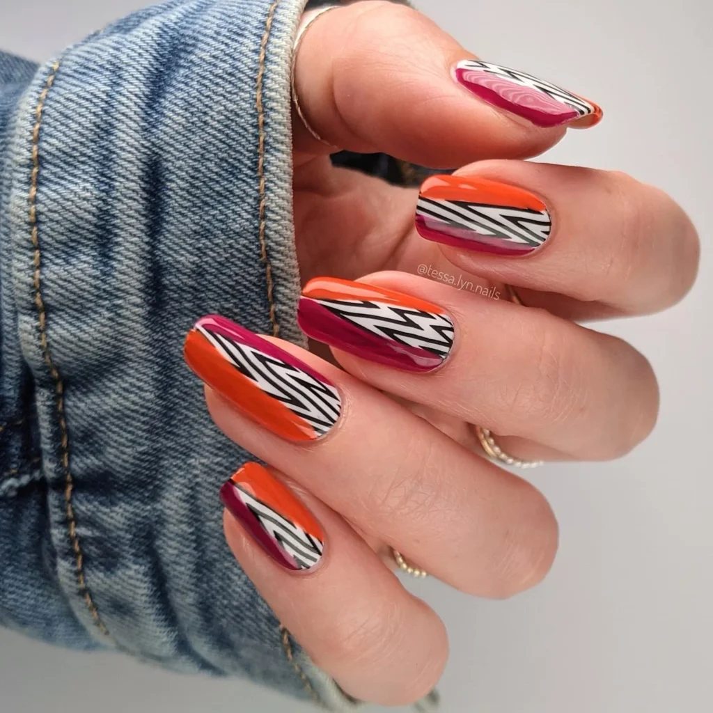 Combining the warmth of orange and pink with bold black zigzag patterns, these nails create a playful and energetic fall design. The alternating stripes and sharp angles in contrasting colors make each nail stand out, bringing a fun, youthful vibe to your fall manicure. The combination of bright colors and geometric shapes is perfect .