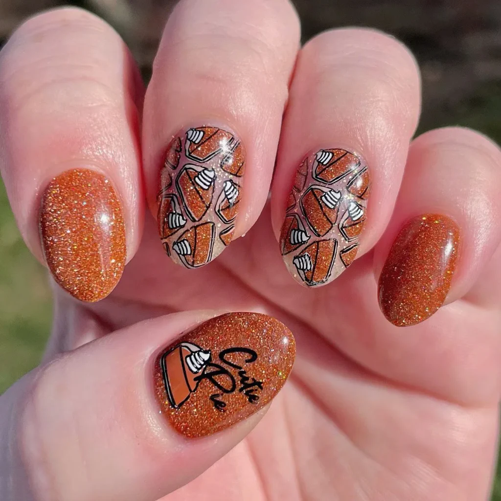 These nails are basically Thanksgiving dessert, but make it fashion. Warm orange glitter meets cute little pumpkin pie decals, complete with whipped cream on top. The accent nail saying “Cutie Pie” is the kind of playful touch that makes you smile every time you glance down.
