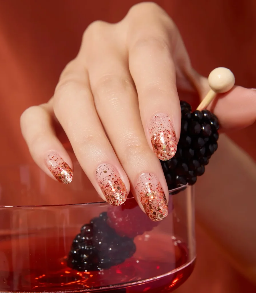 Pro Tip: A jelly nude base makes glitter gradients look extra seamless.