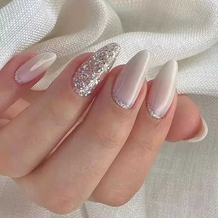 Subtle yet striking, these nails play with balance—soft white paired with dazzling silver. It’s like a cozy winter morning wrapped in chic sophistication. Honestly, this set could easily double as bridal or holiday-perfect glam.