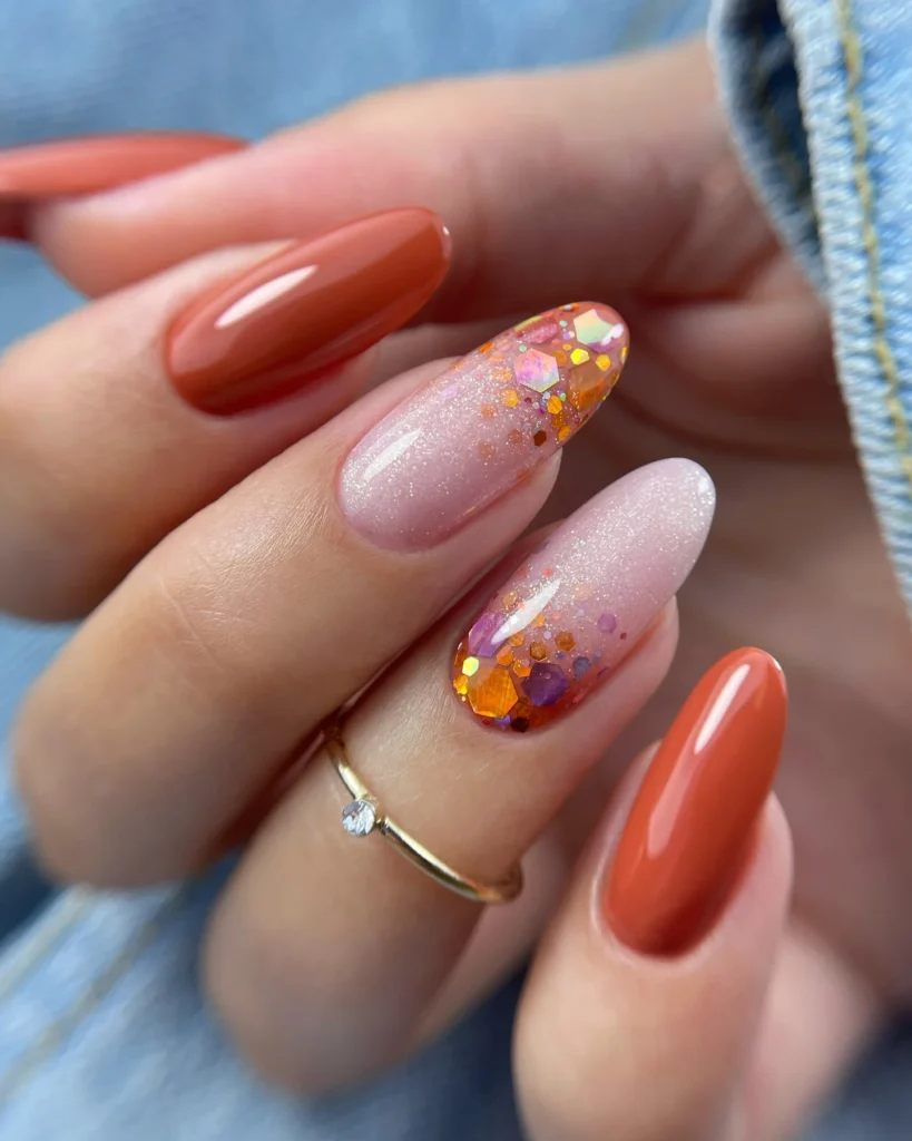 Warm and vibrant, this design feels like pumpkin spice in nail form. The burnt orange tone paired with chunky autumn glitters is festive but wearable.