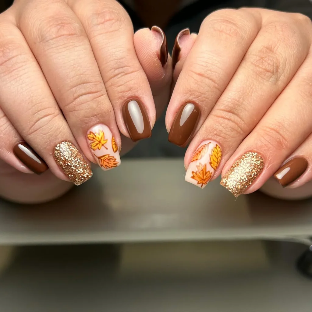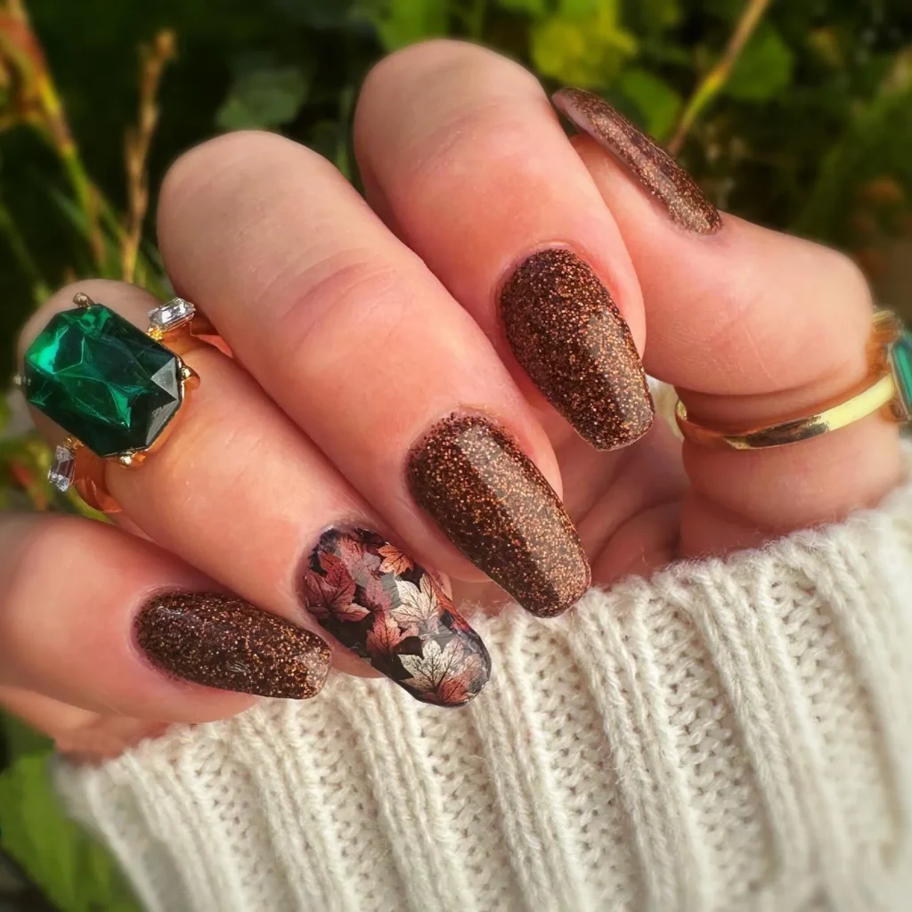 These nails feel like walking through a pile of crunchy fall leaves. The deep brown glitter polish sets the base, while the maple leaf accent makes it seasonal perfection.