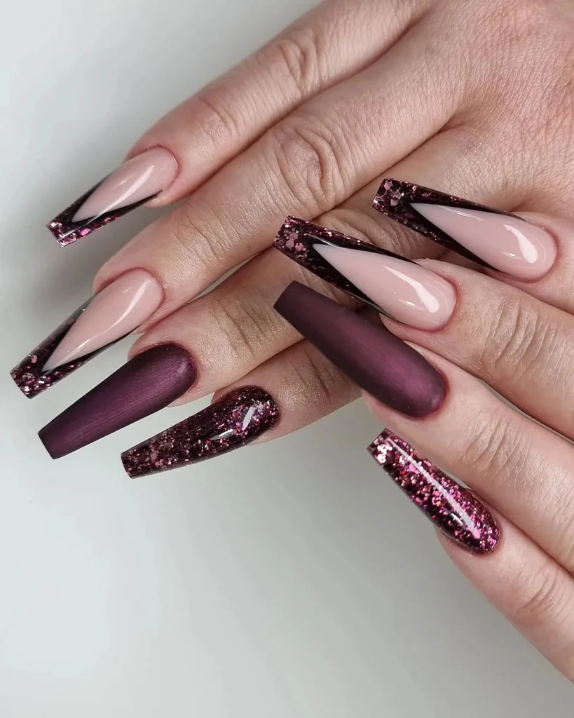 Bold, moody, and completely head-turning—these burgundy nails are fall’s answer to red carpet glam. The mix of matte and glitter textures feels dramatic yet classy.