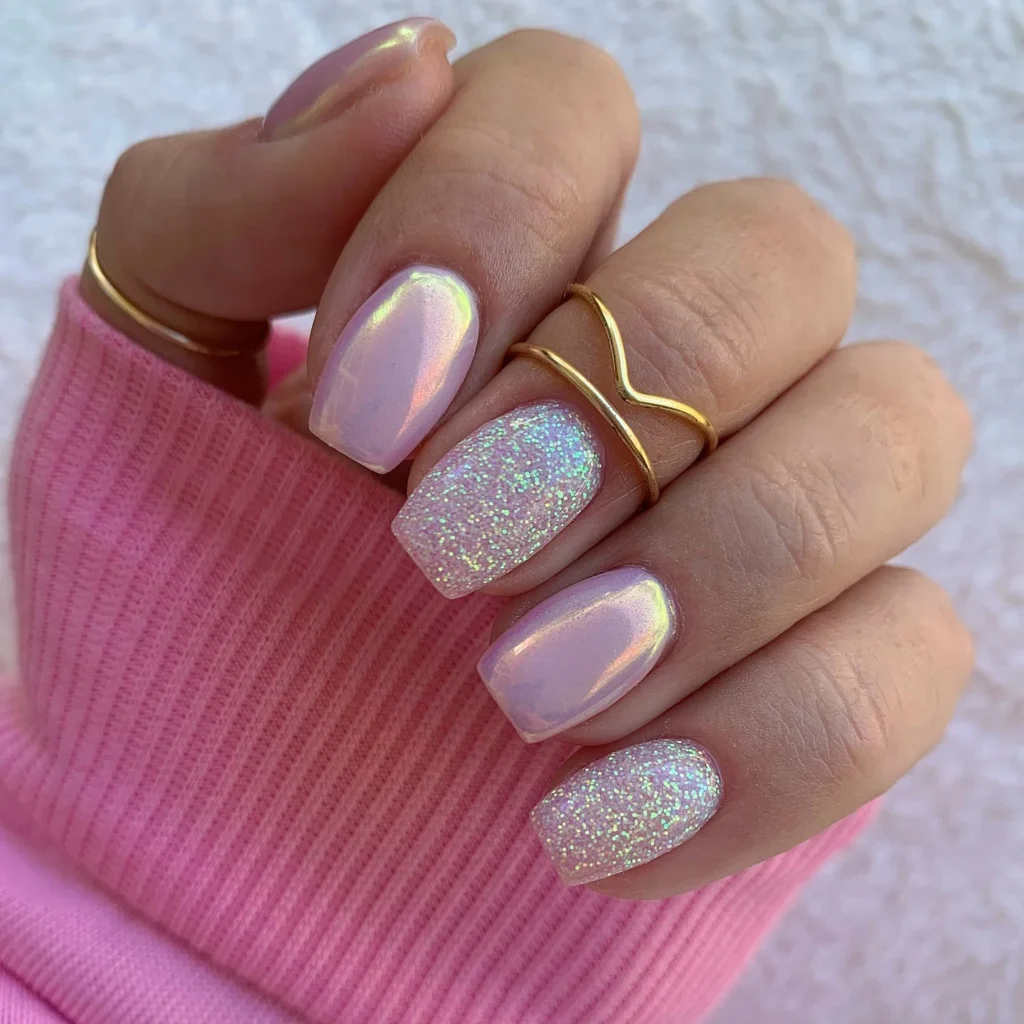This set is dreamy and chic, like a frosted sugar cookie with a hint of glam. The iridescent finish shifts colors in the light, while glitter accents keep things playful.