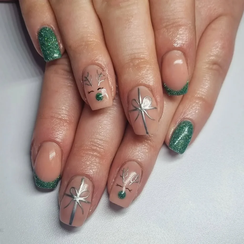 Playful and festive, this design pairs glittery green polish with hand-painted silver bows and reindeer. It’s giving “holiday cheer meets glam chic.” Who wouldn’t smile at this nail art?