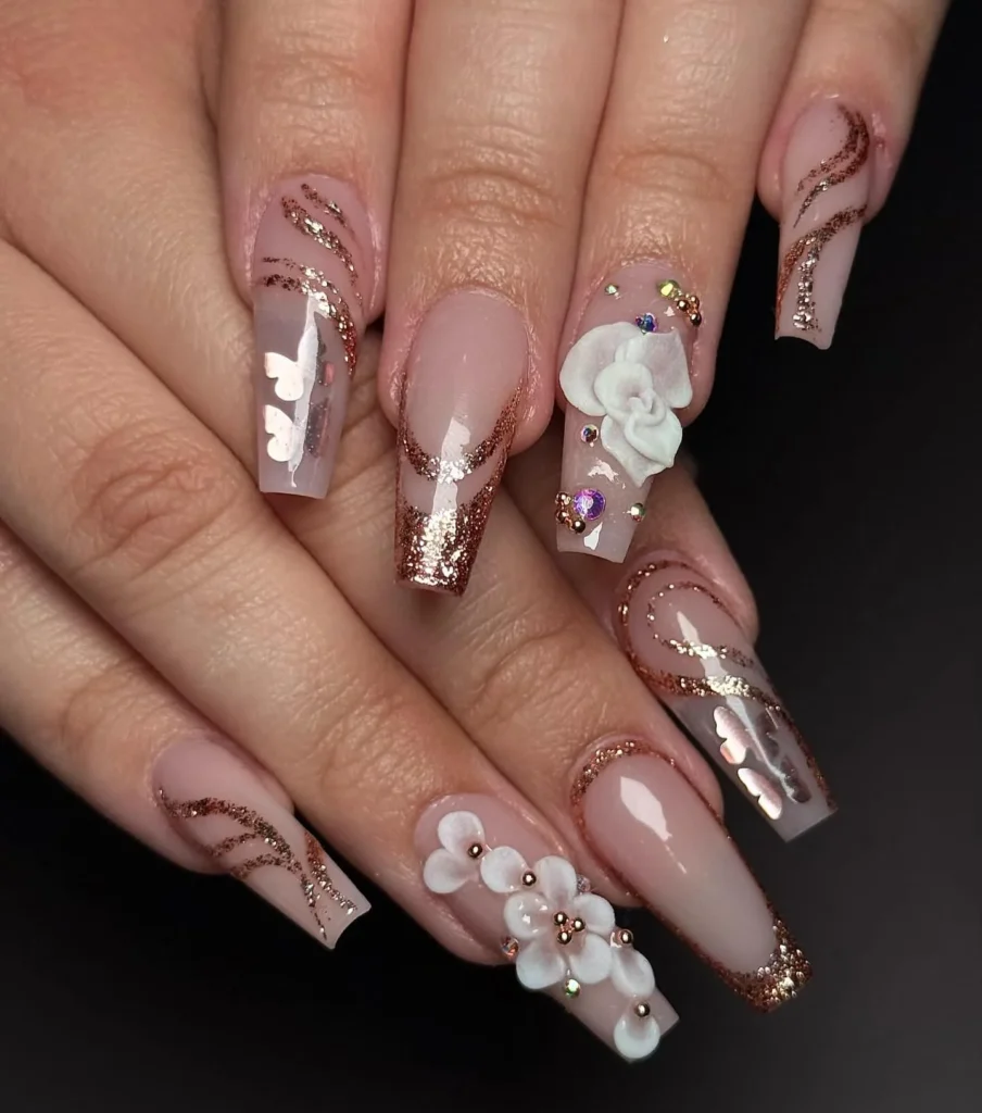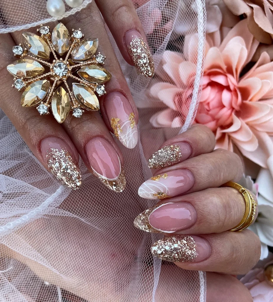 These nails are pure romance—soft pink paired with golden glitter tips and delicate lace-like patterns. It feels like Thanksgiving elegance with a side of bridal chic.