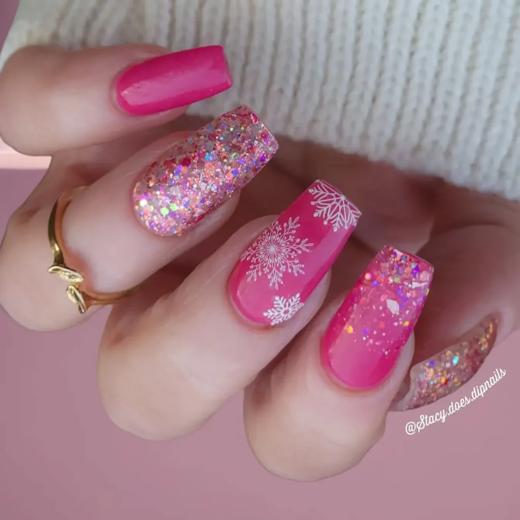 Who says Thanksgiving nails can’t bring a little holiday crossover? This look balances bold hot pink with chunky rainbow glitter and delicate white snowflakes. It feels festive yet playful—like cozying up in a chic sweater with a hot drink in hand.