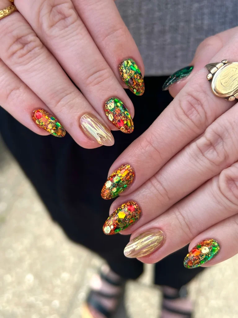 Bold, fun, and colorful—this look mixes jewel-toned glitters with golden accents. It’s basically a Thanksgiving feast for your nails, bursting with autumn vibes. Imagine leaves, lights, and cozy sweaters in one sparkling package.
