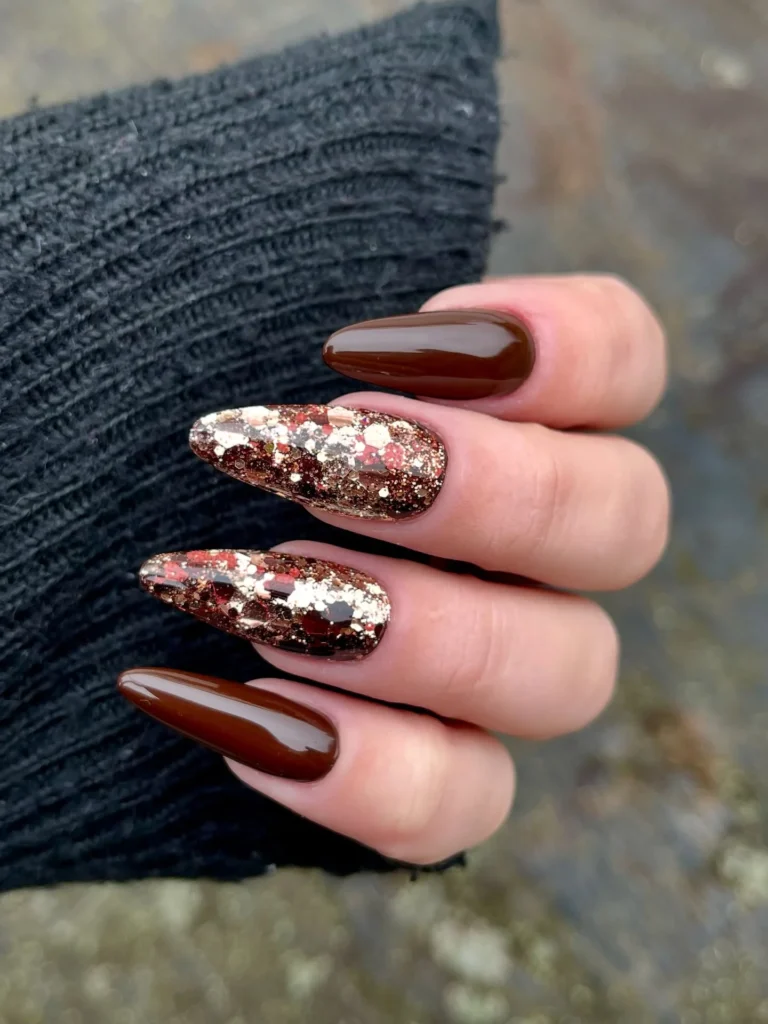 Rich, glossy mocha nails paired with chunky gold-and-copper glitter make this look feel like a decadent dessert for your fingertips.