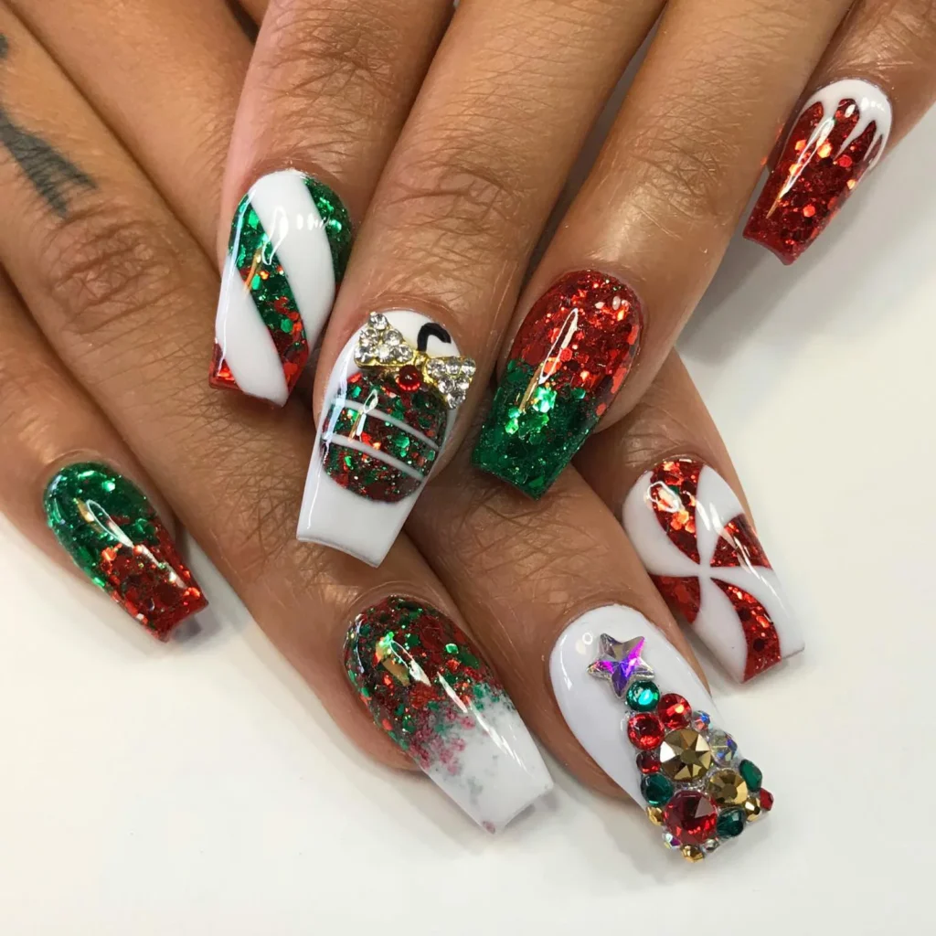 This set screams festive drama. Think bold reds, deep greens, candy cane stripes, and even 3D jewels shaped like a Christmas tree. It’s over-the-top in the best way, the kind of nail art that instantly turns heads at the dinner table.
