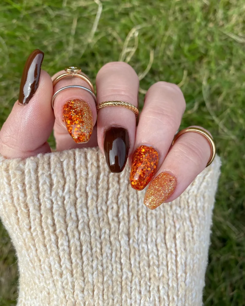 - Paint nails with alternating chocolate and pumpkin-orange glitter shades.